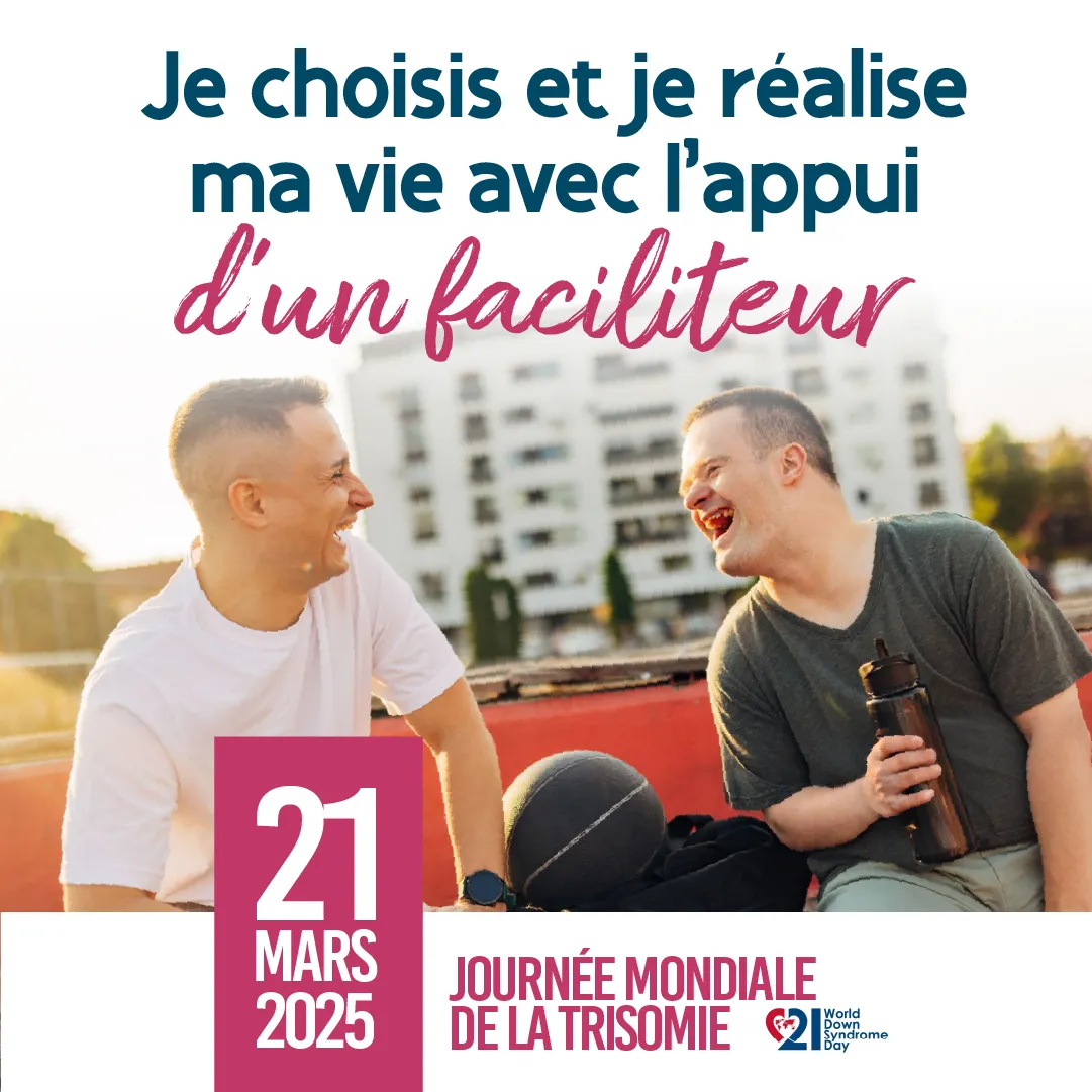 ![]() | 21 mars 2025 - Journée mondiale de la trisomie sur le thème des faciliteurs. Le faciliteur de choix de vie est un professionnel formé pour accompagner les personnes, avec ou sans handicap, pour qu’elles développent leur pouvoir d’agir et un projet de vie qui leur ressemble. Il soutient les choix de vie sans jamais décider à la place des personnes. Il est accessible sans limite d’âge, sans restriction liée au type de handicap, sans notification MDPH et sans limite dans le temps. |
